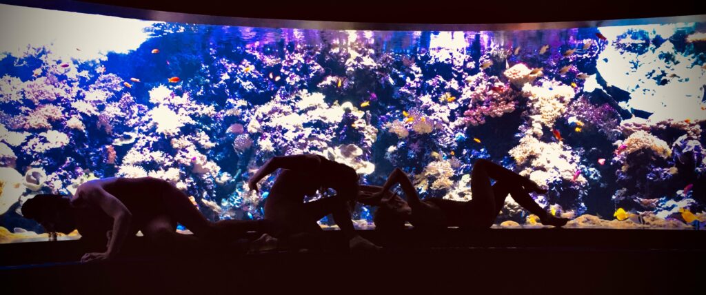 Devenir Corail est une performance chorégraphique, pour trois interprètes, créée initialement pour le festival «Les Art’pulseurs de l’océan», accueilli par l’aquarium scientifique d’Océanopolis à Brest, à l’automne 2021. Cette pièce déambulatoire et pluridisciplinaire,se nourrit de toutes les ressources et potentialités de l’aquarium qu’elle investit. Elle s’inspire de sa scénographie muséale, qu’elle contourne ou détourne avec jubilation et humour, tout en ayant à cœur de témoigner d’enjeux sociaux et environnementaux, et d’établir un climat propice à l’irruption d’un fantastique contemplatif. Il s’agit pour nous de susciter des dialogues décloisonnant entre l’art et la science, entre la recherche poétique et l’expérimentation corporelle, entre la culture savante et la culture populaire, entre le monde terrestre et le monde marin, entre l’humain et le non-humain.